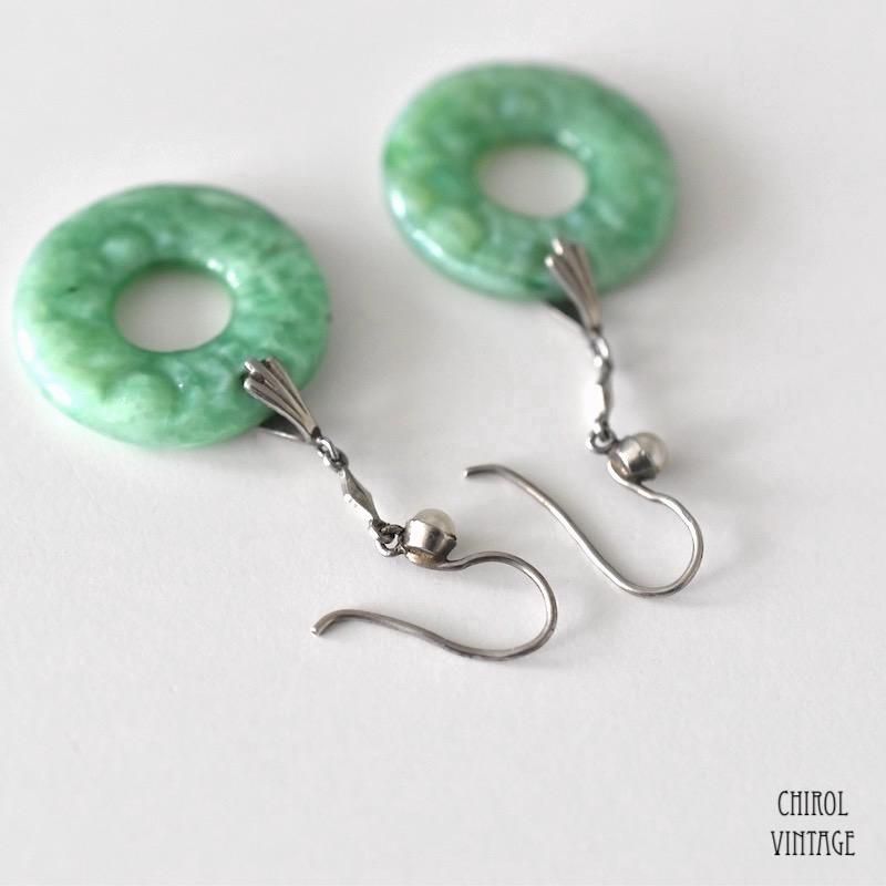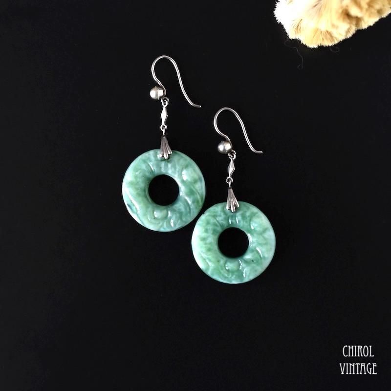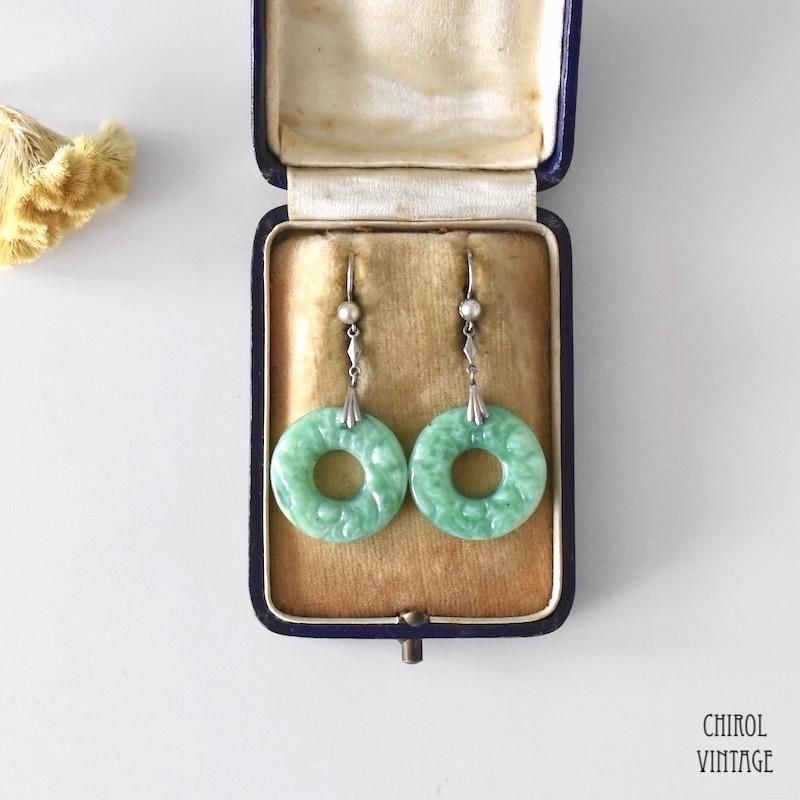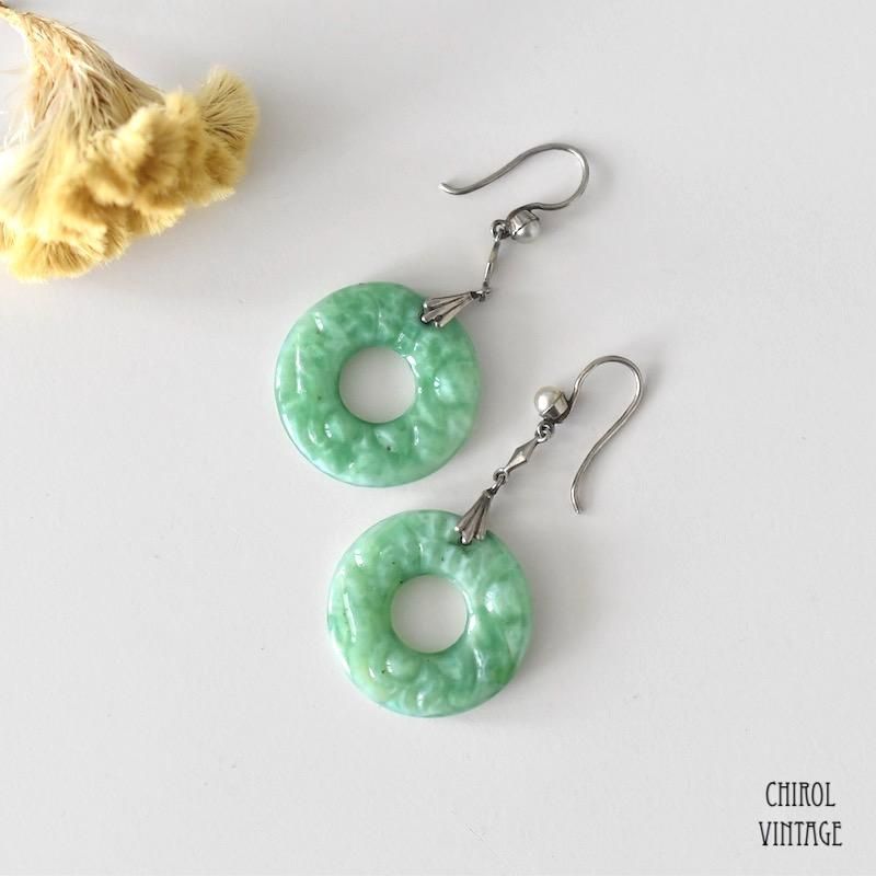 アールデコに流行したジェイドを模した、ペキングラスのフープドロップピアス。