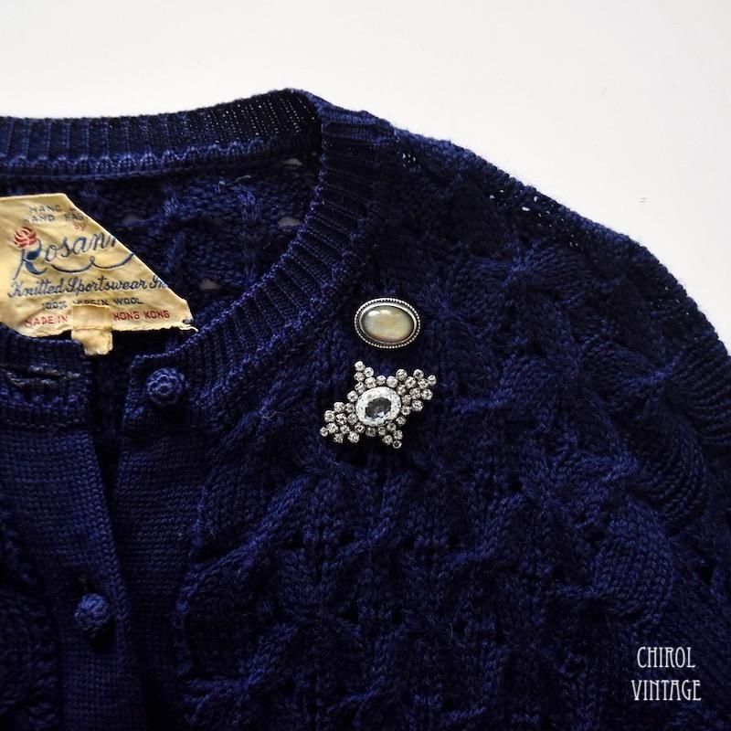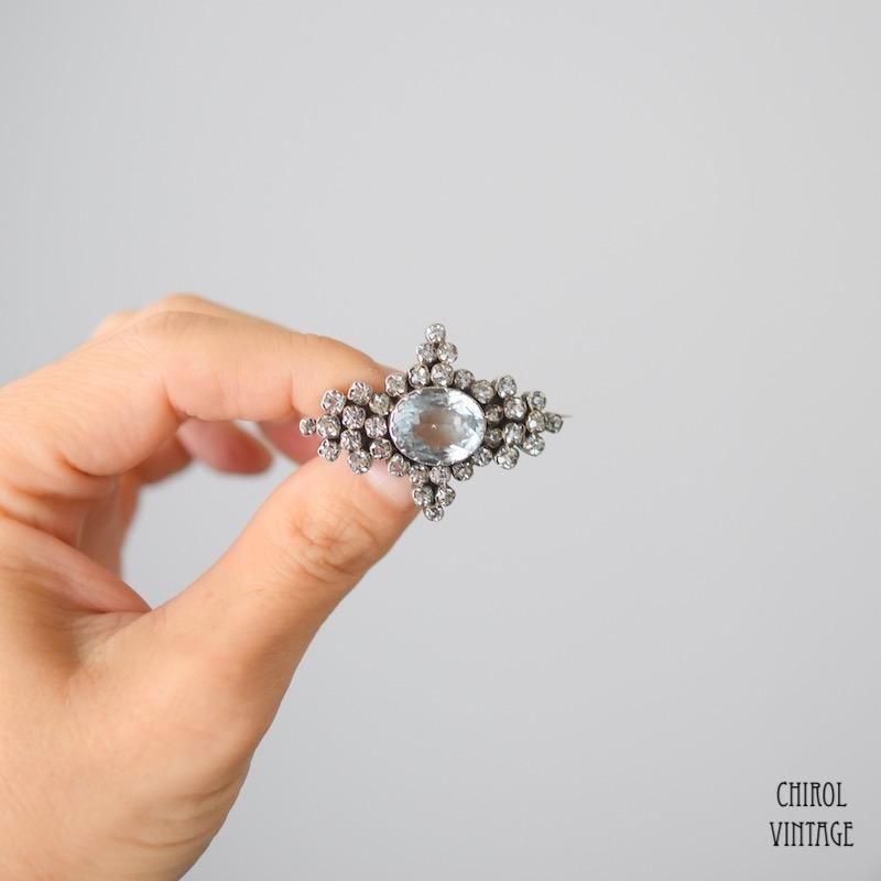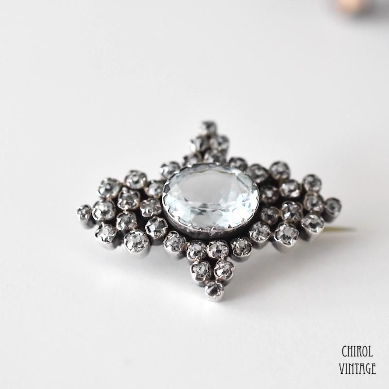 アンティーク アクアマリングラスxロククリスタル シルバーブローチ