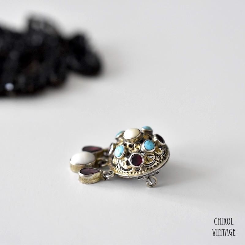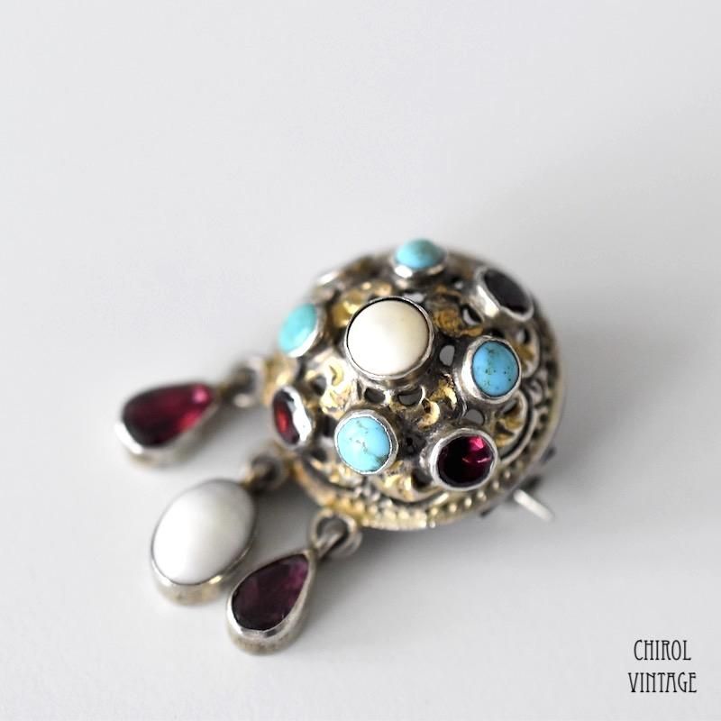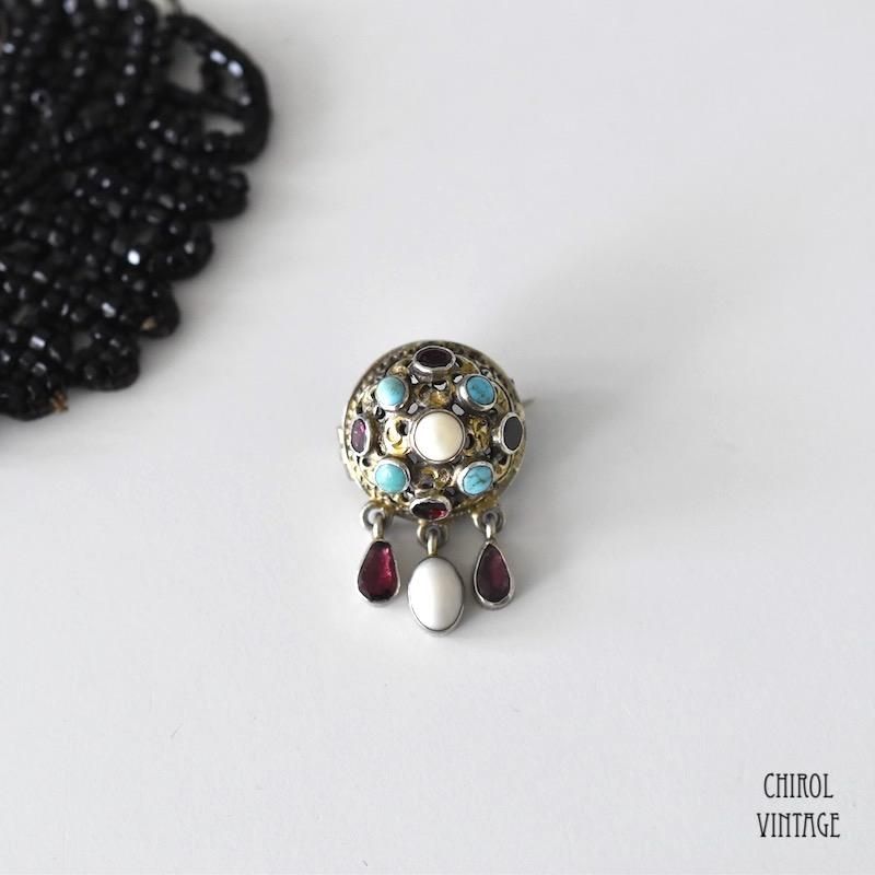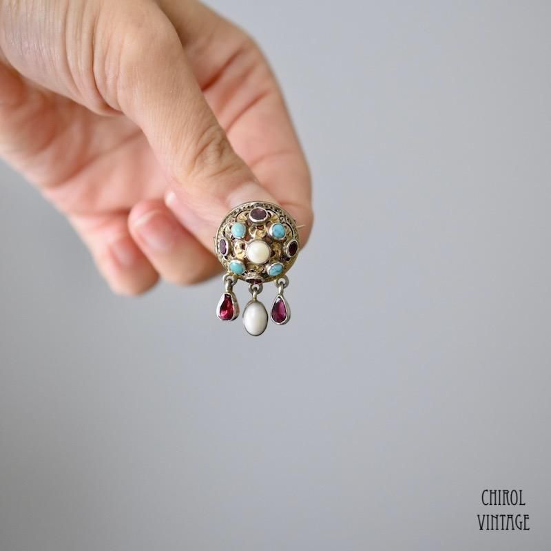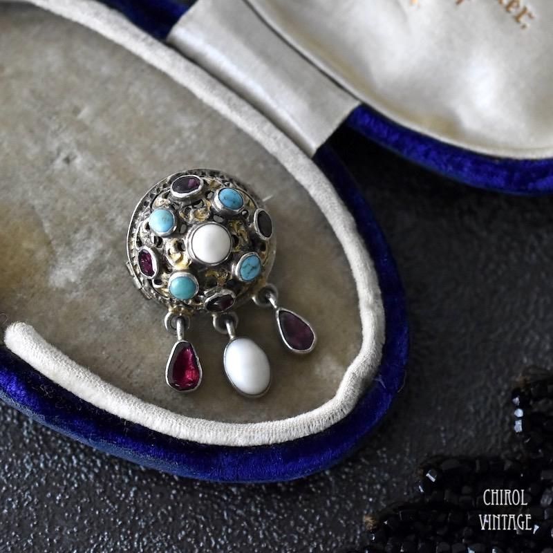 アンティーク オーストロハンガリアン シルバー ガーネットxターコイズxパールフリンジブローチ
