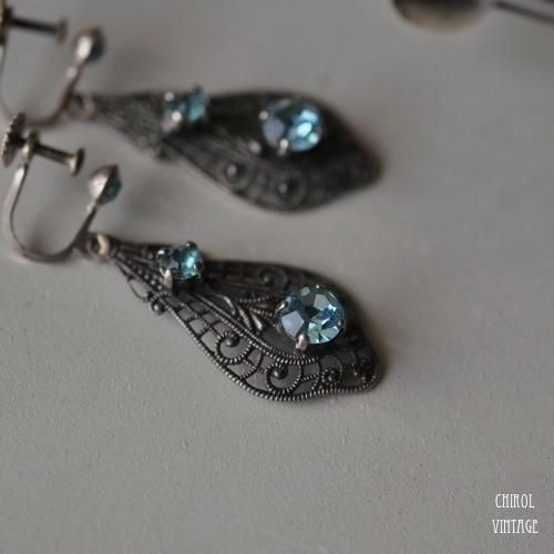 アクアマリンカラーが清楚で女性らしい、アンティークなムードのイヤリングです。