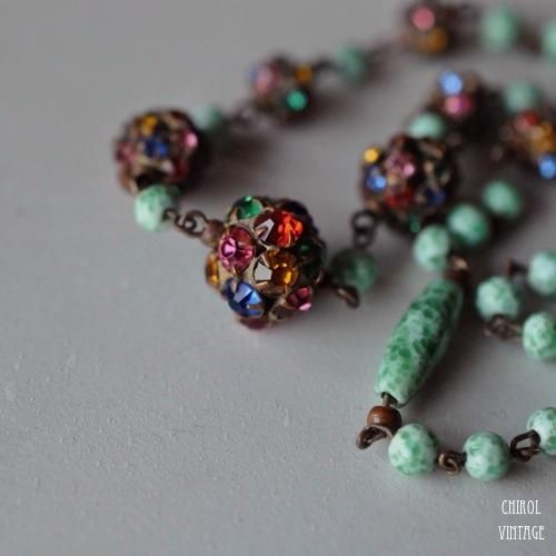 ヴィヴィッドなカラーのミラーボールと、ミルクグリーンのペキングラスがおしゃれなアールデコのネックレス。