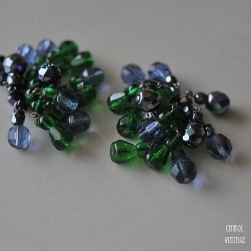 全体的に丸みを帯びたファセットカットが施されたビーズからは、ヴィンテージグラスの雰囲気が感じられ、グリーンのベルシェイプのビーズは形もめずらしく、とても可愛らしいです。