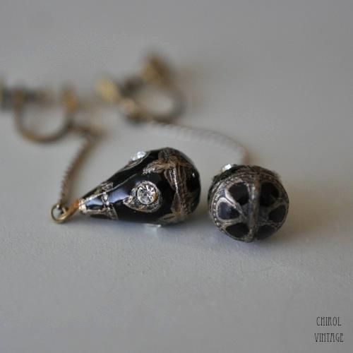クロイゾネ(七宝焼)のエナメルに、シャンデリアのような模様とラインストーンが埋め込まれたティアドロップがかわいらしいです。