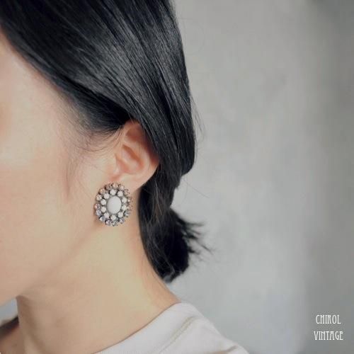 ホワイトのミルクグラスと、ガーリーなパステルカラーのラインストーンがキュートなイヤリング。