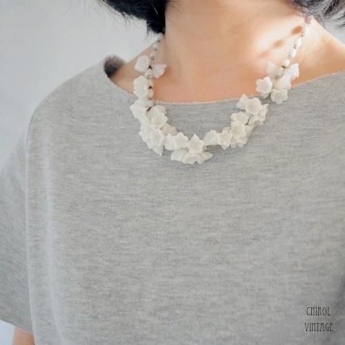 ホワイトのフラワーが贅沢にクラスターしたヴィンテージグラスのネックレス。