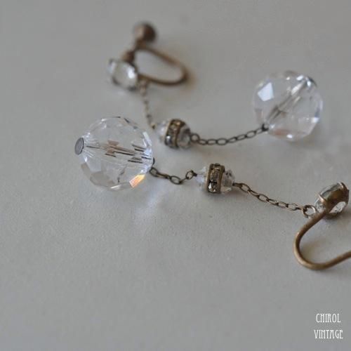 耳たぶ部分にはクロウセットでクリアなラインストーンがあしらわれ、そこから華奢な長めのチェーンでクリスタルグラスがぶら下がっています。