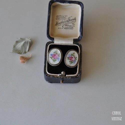 ギロッシェと呼ばれるエナメルワークに、ピンクのローズがハンドペイントで描かれた、フェミニンなムードのイヤリング。