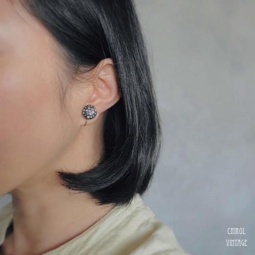 こんもりとボリュームのあるボタンシェイプののセルロイドに、クリアなラインストーンと小さな小さなシルバースタッドが、ペイヴセッティングで埋め込まれています。