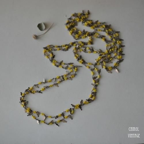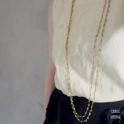 落ち着いたヴィンテージイエローのビーズがメタルワイヤーで繋がれ、その間に薄い小さなのメタルプレートが、タッセルのようにあしらわれています。