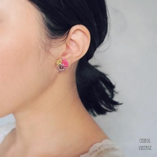 クリアなドームシェイプのルーサイトに、ピンク、イエロー、パープルのドライフラワーが閉じ込められた、とってもかわいいデザイン。