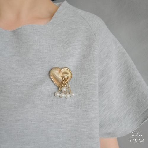 立体的なサテンゴールドのハートからパールがこぼれ出した、とってもかわいいデザインのブローチ。