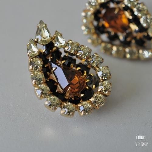 アンバーカラーのティアドロップストーンをセンターに、その周りをフレンチジェット、その更に周りをペールイエローのラインストーンが囲っています。
