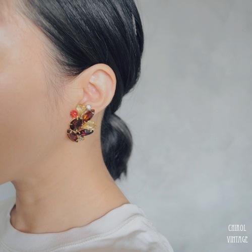 異なるシェイプのウォームカラーのストーンが、センス良くアレンジされた大ぶりビジューイヤリング。