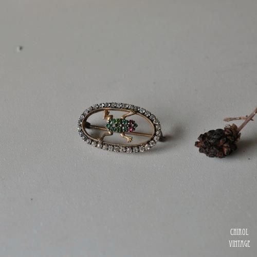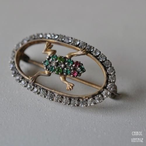 フロッグのボディにはエメラルドとミントグリーンのグラス、目にはピンクルビーのグラスがクロウセッティングであしらわれています。