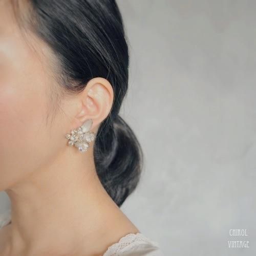 立体的にアレンジされたビジューストーンに、ころころとぶら下がるようにセットされたオーロラクリスタルが、更に立体感をプラスして、顔周りで動きを見せてくれます。