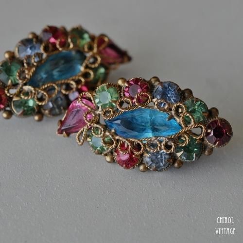 ルビーレッド、ミントグリーン、ペールブルーのラインストーンに、アクセントとなるペアシェイプのピンクのストーンが並んで、ペイスリーのようなリーフシェイプに。