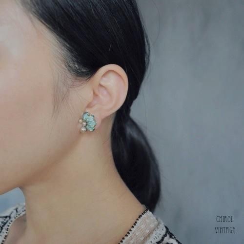 アクアマリンカラーのペタルグラスと、品の良いシャンパーンパールがセンス良く並んだ、ユニークなデザインのイヤリング。