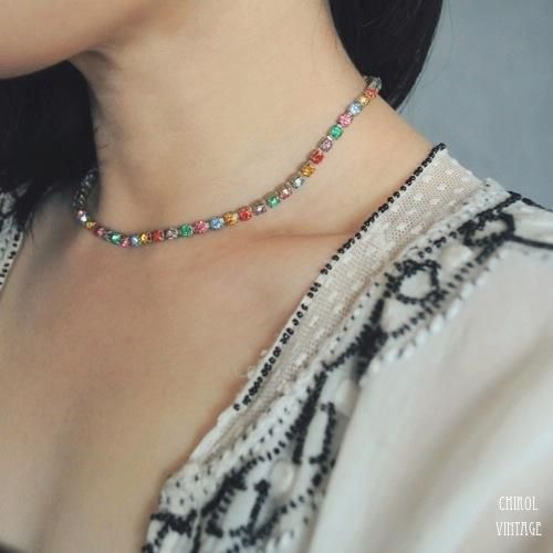 カラフルなラインストーンが並んだ、チェコグラスのヴィンテージネックレス。
