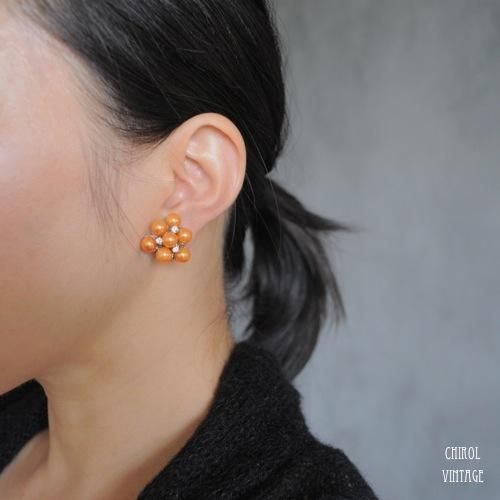 オレンジパールxラインストーン クラスターイヤリング
