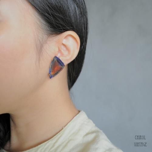 ブルーとオレンジのバイカラーのアートグラスが目を引く、ビッグビジューストーンイヤリング。
