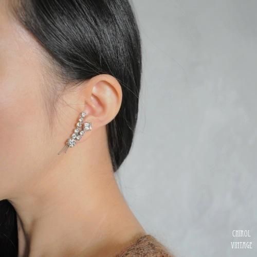 デザイン性あるユニークなシェイプがかわいい、クリアラインストーンのクリップイヤリング。