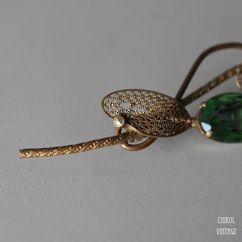 曲線が美しいアールヌーボースタイルのデザインとゴールドとグリーンのコントラストが美しい、アンティークなムードあふれるブローチです。