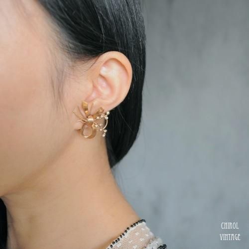 流れるように結ばれたゴールドのリボンがかわいいデザインのクリップイヤリング。