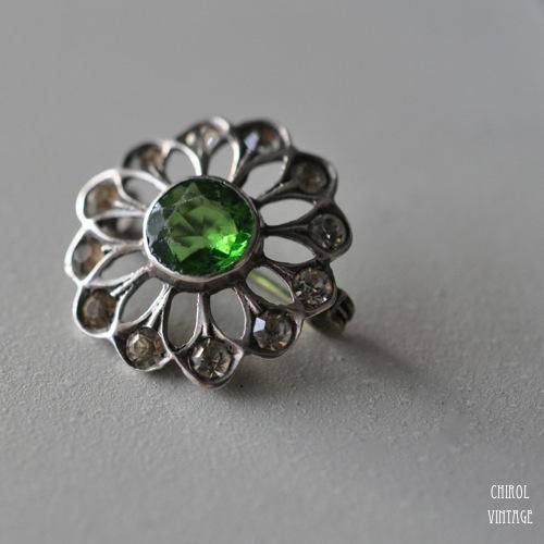 ベゼルセットされたペリドットグラスをセンターに、スターリングシルバーがフラワーペタルのようにデザインされ、ペタルの端にはクリアなグラスストーンが埋め込まれてセットされています。
