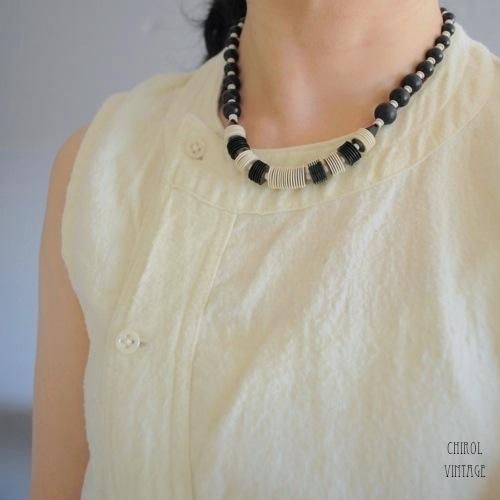 首回りには、ブラックとホワイトのビーズがグラデュアルな大きさに並び、小さなアイボリーホワイトのプレートも一緒に繋がれています。