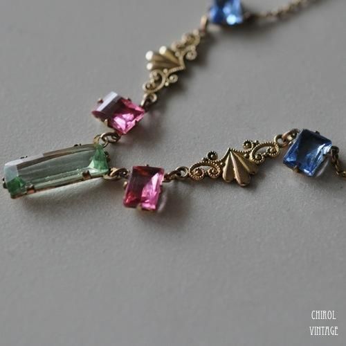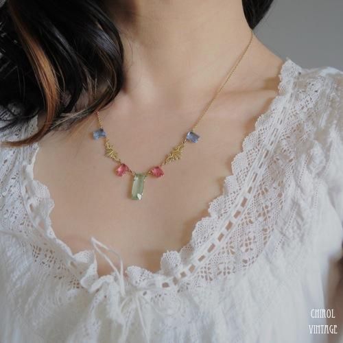 淡いカラフルなパステルカラーのグラスストーンがかわいい、アールデコのロールドゴールドネックレス。