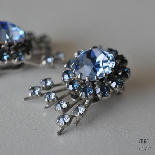 センターの大きめなペールブルーのビジューには、細かいファセットカットが施され、フォイルバックのシルバーがキラキラと多面に輝く、奥行きのある美しいグラス。