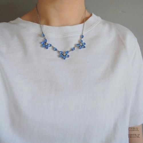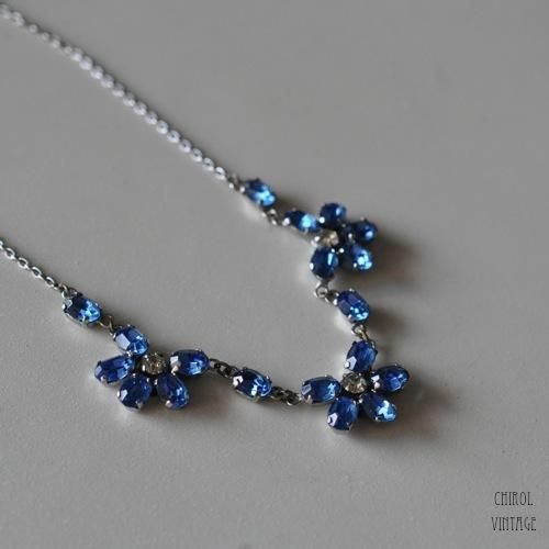 輝きの良いサファイアブルーのビジューがきれいなフラワービジューネックレス。
