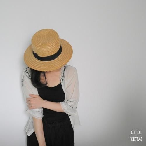 ボックスシェイプのトップがちょっぴりマニッシュな雰囲気のヴィンテージストローハット。