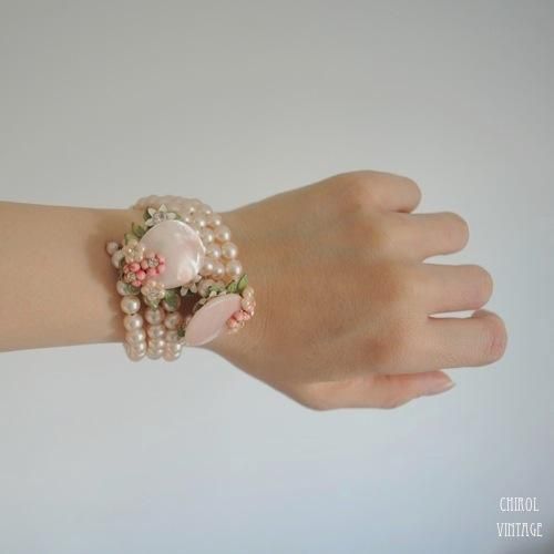 コイルの端には、マザーオブパールのプレートにエナメルリーフ、パールのフラワーがクラスターしてデコレーションされた、とってもかわいいデザイン。