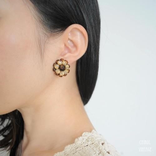 アンバーxサテンベージュ バイカラービーズイヤリング