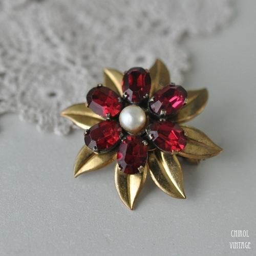 ゴールドリーフxルビーレッドビジュー フラワーブローチ