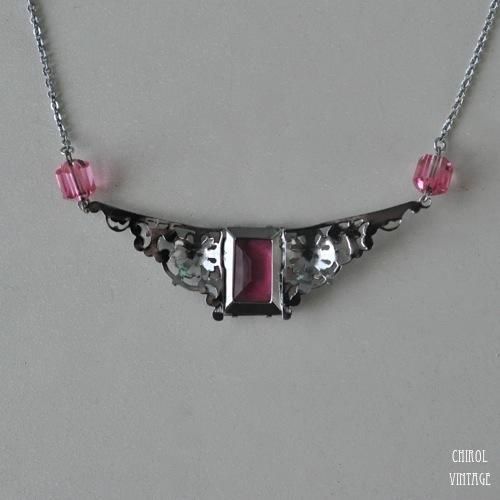 胸元を飾るピンクのグラスストーンと、シルバーのフィリグリープレートがユニークなデザインのネックレス。