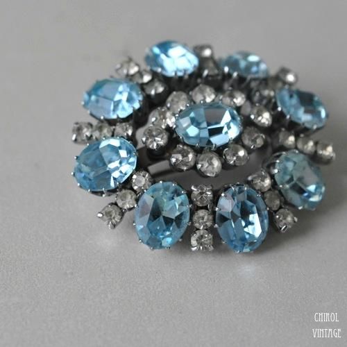 ブローチは、少しドームになったオーバルシェイプで、サークルに並んだアクアマリンから、ラインストーンがスターバーストのようにアレンジされています。