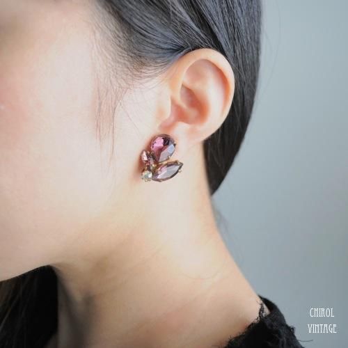 ゴロッとしたペアシェイプのビジューを中心に、大小のマーキスビジューとオーロララインストーンがひと粒、少しアングルのある位置でアレンジされています。