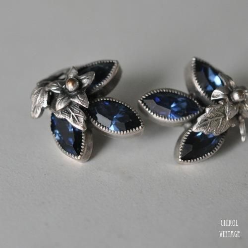 ディープなサファイアブルーのビジューは、縁にしっかりと刻みの施されたミルグレインでベゼルセットされ、シルバーカラーのリーフとフラワーが、立体的にアレンジされたデザイン性の高いアイテム。