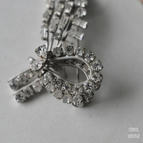 小さなラインストーンとバゲットビジューのリボンのような立体的なシェイプのブローチ。