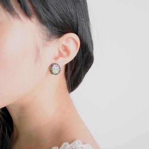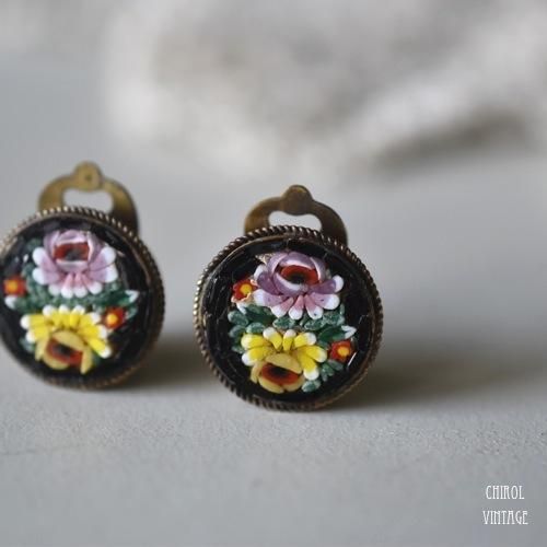 ブラックにパステルカラーがシックな、マイクロモザイクのラウンドクリップイヤリング。