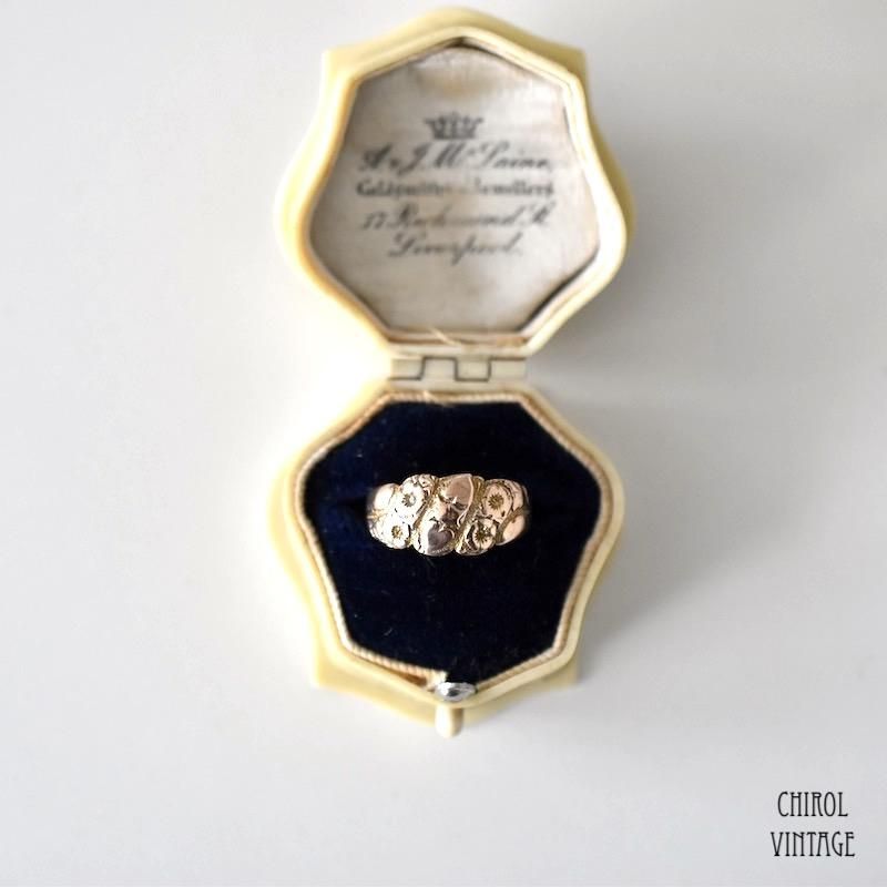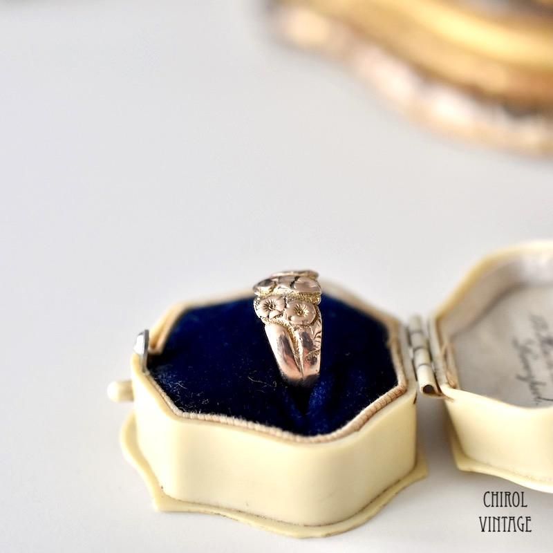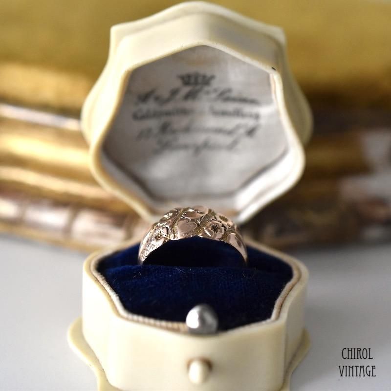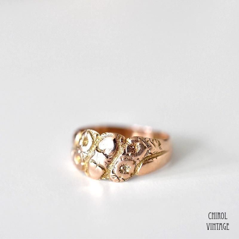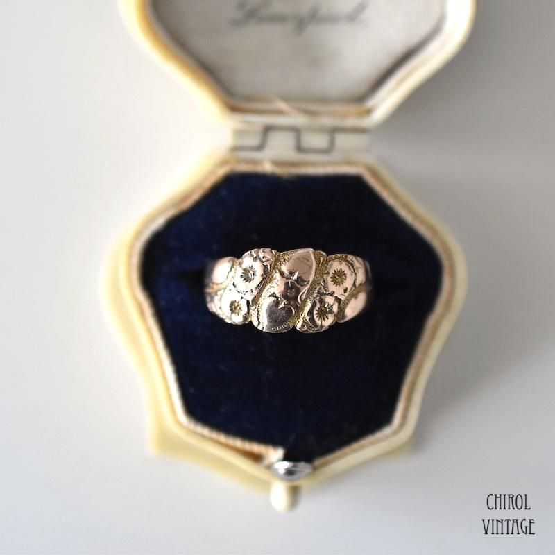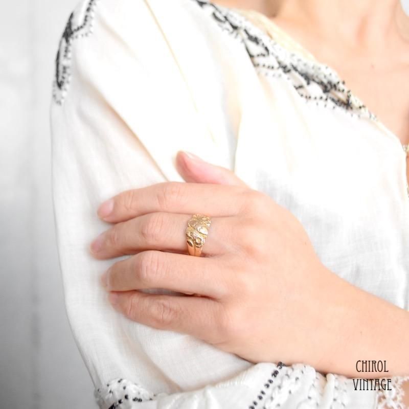 ひと目で分かるアンティークデザインでありながら、現在のファッションにも違和感なく溶け込み、個性を与えてくれるゴールドリングです。