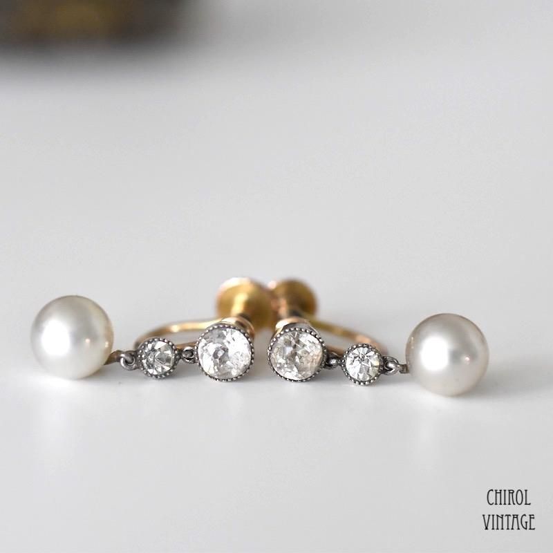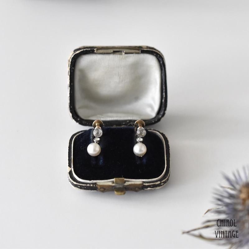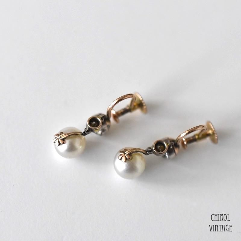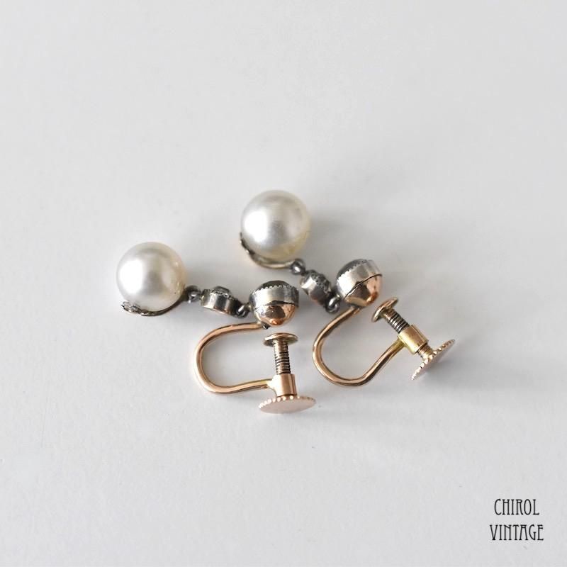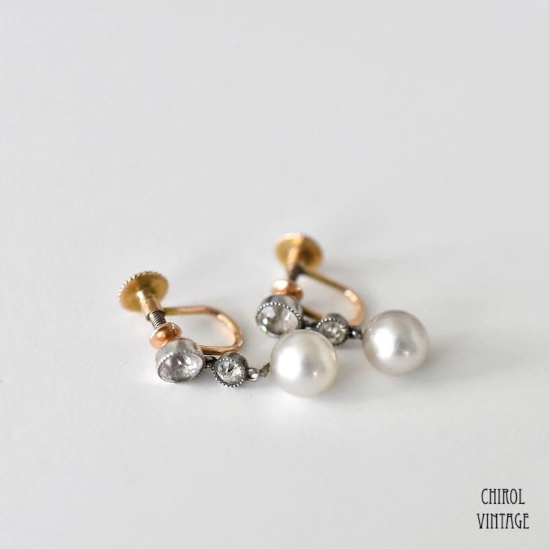 アンティーク 9Kゴールド クリアグラスxパールドロップイヤリング