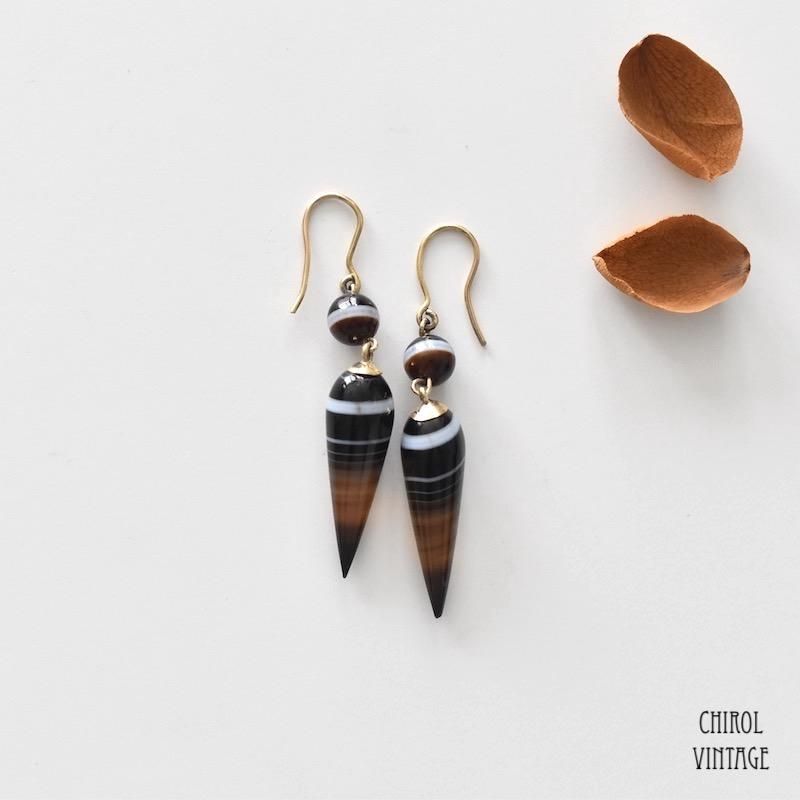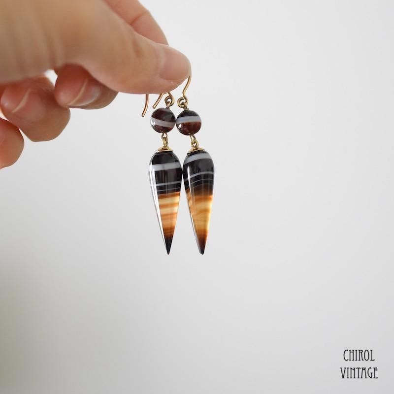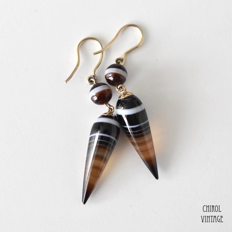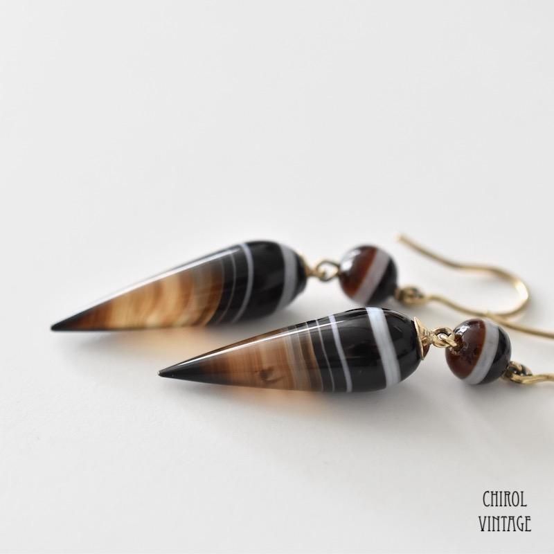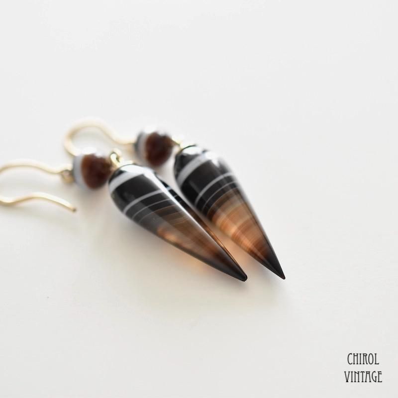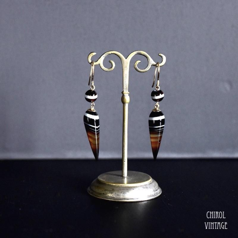 ヴィクトリアン中期のアイコニックなジュエリー、バンデットアゲートの9Kゴールドピアス。